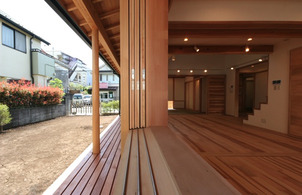 縁側のある家 木造2階建て住宅 新築 壁面内に完全に引き込むことができる木製の引き戸を開けると、濡れ縁と深い軒の半屋外空間が庭と室内をゆるやかにつなげる和風住宅。 共同設計;武山肇(LLPテイクスにて) アルバム